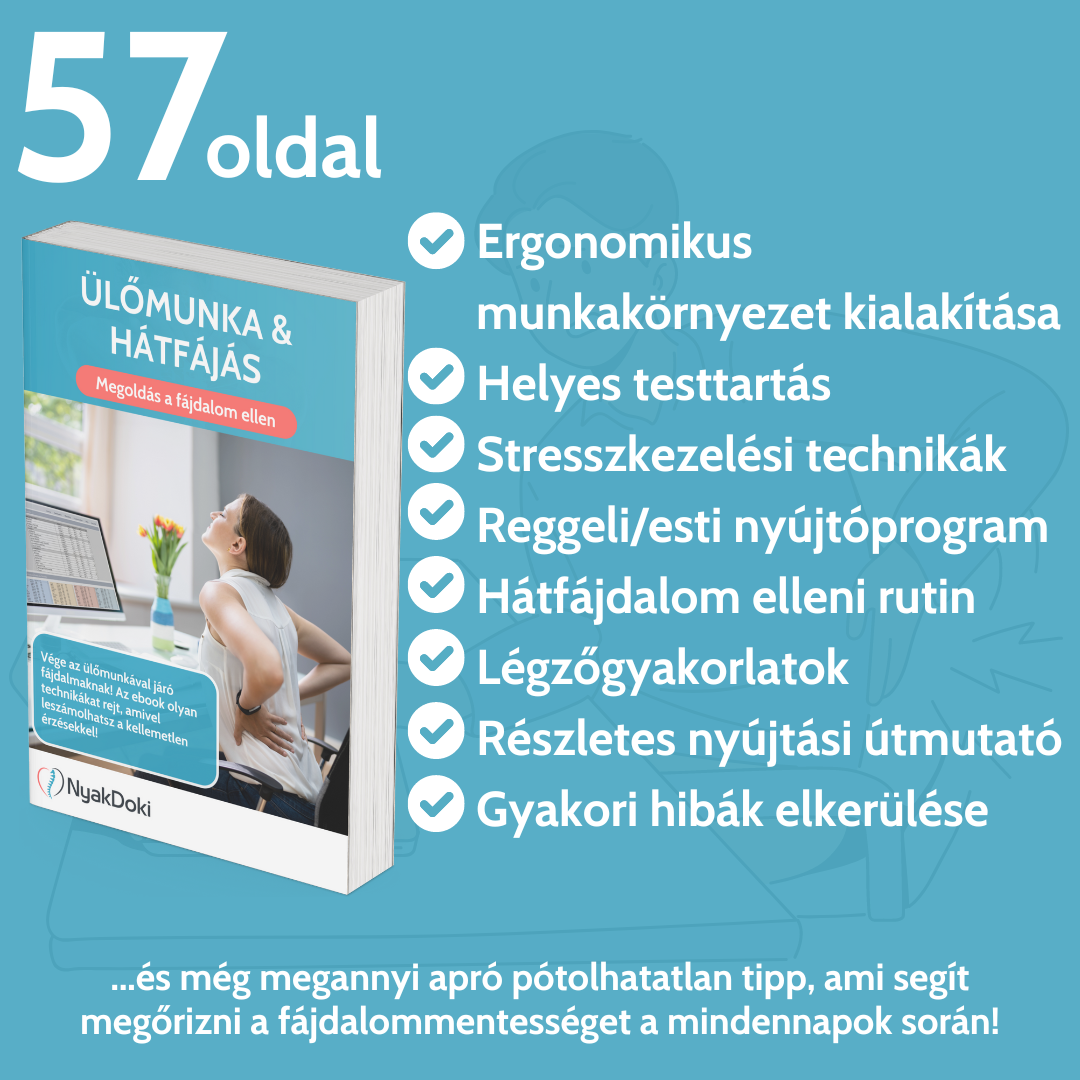 Az "Ülőmunka & Hátfájás - Megoldás a fájdalom ellen" egy 57 oldalas átfogó útmutató, amely azonnal letölthető PDF formátumban. Tartalmaz könnyen követhető gyakorlatotokat az íróasztalnál, részletes útmutatót az ergonomikus munkakörnyezet kialakításához, és napi mozgásprogramot.